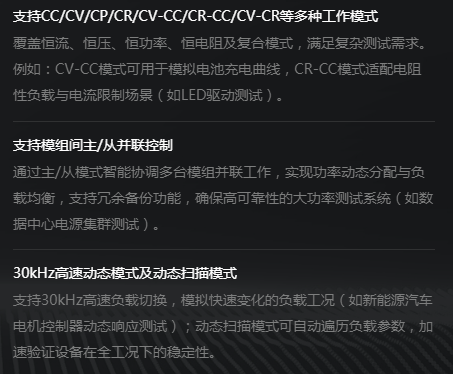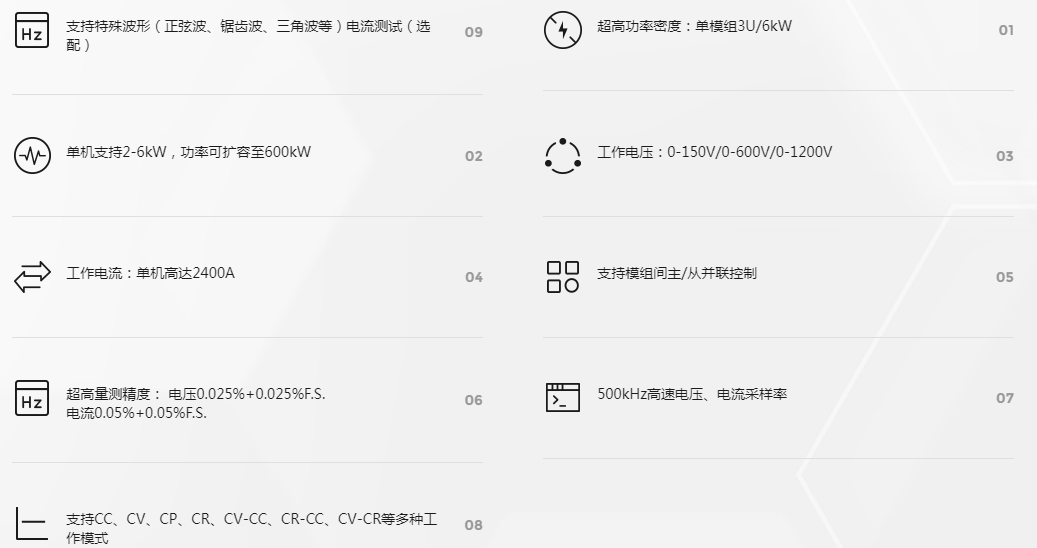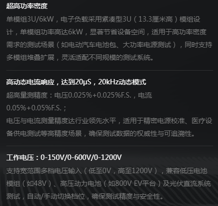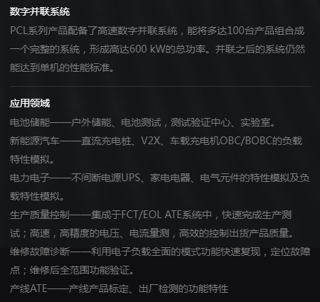 PCL系列直流电子负载是一款集高精度、高性能、高功率密度于一体的大功率直流电子负载,具备快速动态响应与稳定可靠的负载模拟能力,能满足电源及电池产品严苛的测试需求。其具有行业领先的功率密度,独立的高精度测量系统,良好的行业负载适应性。 PCL系列产品除了基本的恒电流,恒电压,恒电阻,恒功率模式外,还包含各种模式动态负载模拟,短路测试、序列编程功能等。内置函数发生器功能,并支持正弦波、矩形波、三角波等电流波形。