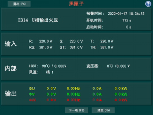 (9)具备“黑匣子”功能,实时监控内部电压,电流,温度等参数,异常情况立即报警并自动记录运行参数,便于后期查看及维修