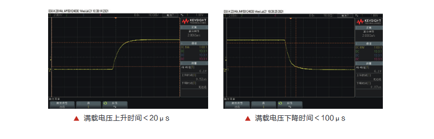 N83624系列具有快速的动态响应能力,10%负载-90%负载,恢复到原电压-50mV以内的时间<200μs,保证电压或电流的上升波形高速且无过冲,为待测物提供了稳定的供电,符合对电源要求苛刻的产品测试要求。