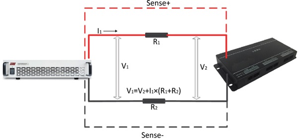 为了保证对被测设备提供精确的电压,N8330系列产品采用四线制接法,即两线用于输出电压,另外两端直接测量 被 测 设 备 电 压 。通 过 S E N S E 端 测 量 线 能 消 除 电 源 到DUT之间因引线电阻而引起的电压降。