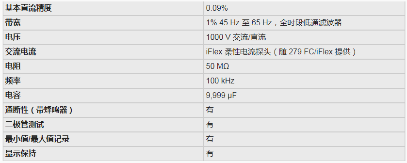 主要参数:1000 V 交流和直流电压测量;可测量高达 2500 A 的交流电流(通过选装的 iFlex 柔性电流探头);温度测量范围 -10 °C 至 200 °C(14 °F 至 392 °F);可测量最高达 50 MΩ 的电阻